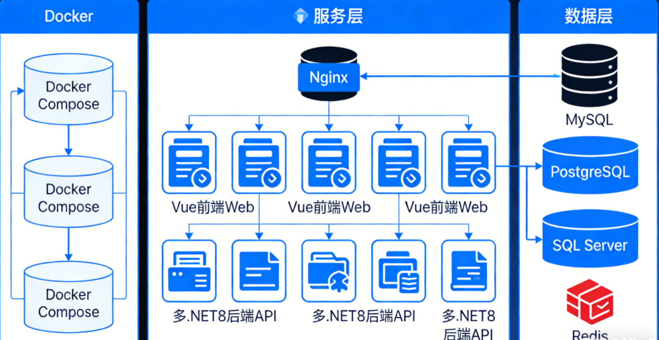 Docker Compose部署多.NET+后端API+多Vue前端Web 完整记录(含多数据库扩展+实用场景,亲测无坑)