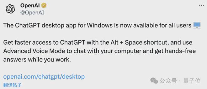 除了 Mac 版功能更新,这次 OpenAI 也给 Windows 用户带来了好消息——