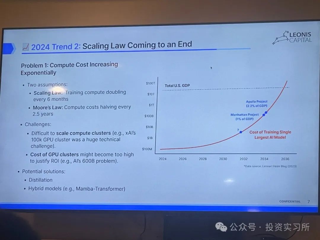 大模型这块我不是特别熟悉,大部分聊的都是共识的东西,比方说 Pre-Training 在现有架构下基本上都认为已经结束。不过有几个观点比较有意思:文字是通往智能的捷径,视频和文字之间的效率差距是几百倍。不同模态的对齐,目前还没有形成共识;