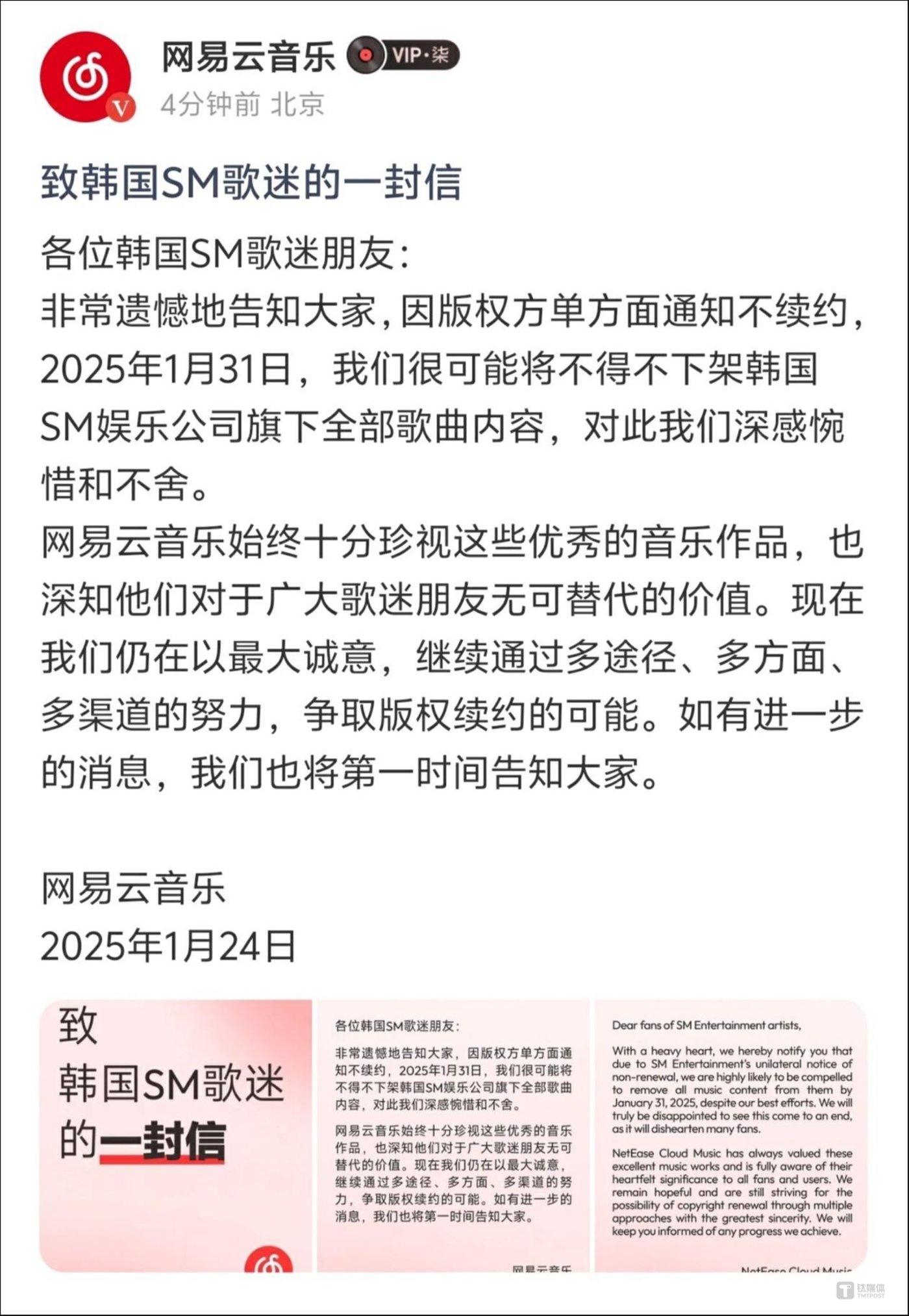1 月 24 日,网易云音乐发布《致韩国 SM 歌迷的一封信》称,因版权方单方面通知不续约,网易云音乐很可能不得不于 1 月 31 日下架韩国 SM 娱乐公司旗下全部歌曲内容。