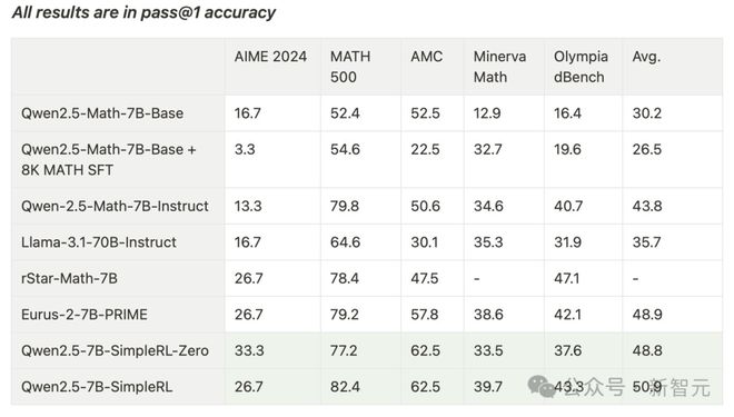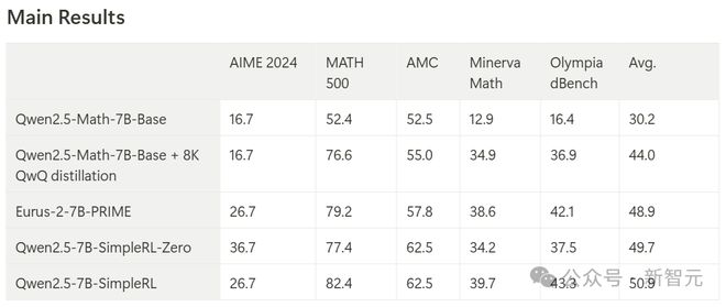 Qwen2.5-7B-SimpleRL 则首先通过 Long CoT 监督微调(SFT)作为冷启动,然后再进行强化学习。