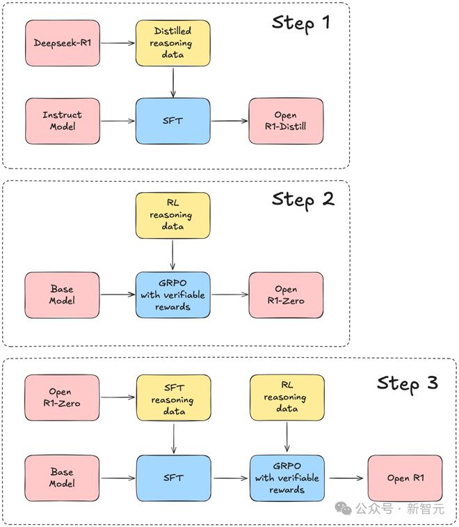 研究团队以 DeepSeek-R1 技术报告为指导,将整个复刻过程划分为三个关键步骤。