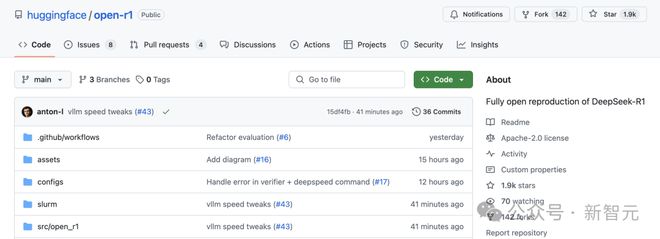 这个项目叫做 Open R1,当前还在进行中。发布到一天,星标冲破 1.9k,斩获 142 个 fork。