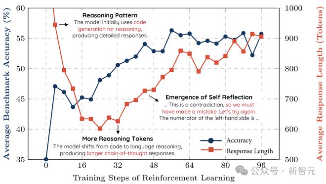 随后,生成长度开始再次增加,此时出现了自我反思机制。