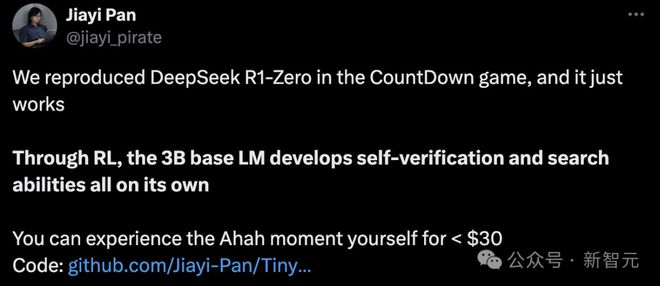 来自 UC 伯克利博士生潘家怡和另两位研究人员,在 CountDown 游戏中复现了 DeepSeek R1-Zero。