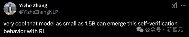 苹果机器学习科学家 Yizhe Zhang 对此表示,太酷了,小到 1.5B 的模型,也能通过 RL 涌现出自我验证的能力。