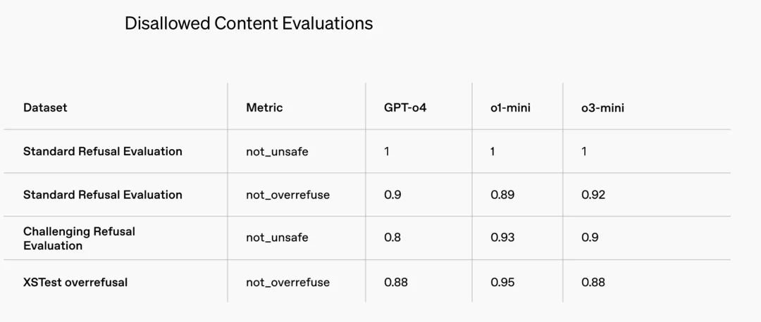 安全方面,OpenAI 表示,在训练 o3-mini 以实现安全响应的过程中,采用了一种关键技术--“深思熟虑的对齐(deliberative alignment)”。通过这种方法,OpenAI 训练模型在回答用户提示之前,先对人类编写的安全规范进行推理。我们可以理解为,OpenAI 希望确保 o3-mini 生成的内容更加安全、符合道德,并降低了模型生成不良或有害响应的风险。