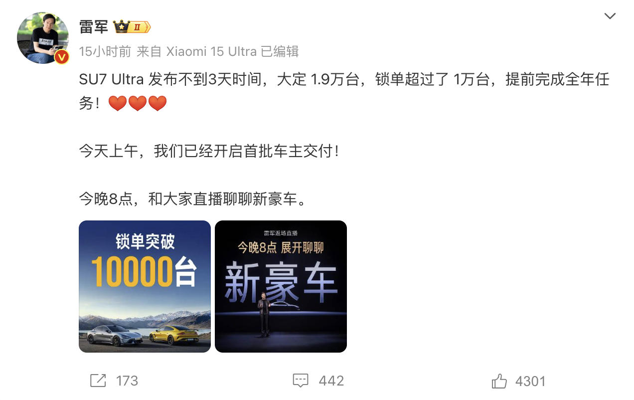 早些时候,雷军还发文称,「Ultra 订单远超预期,今天下午继续讨论 Ultra 提产问题。如果大家已决定购车,尽快锁单,我们将按锁单顺序排产。」