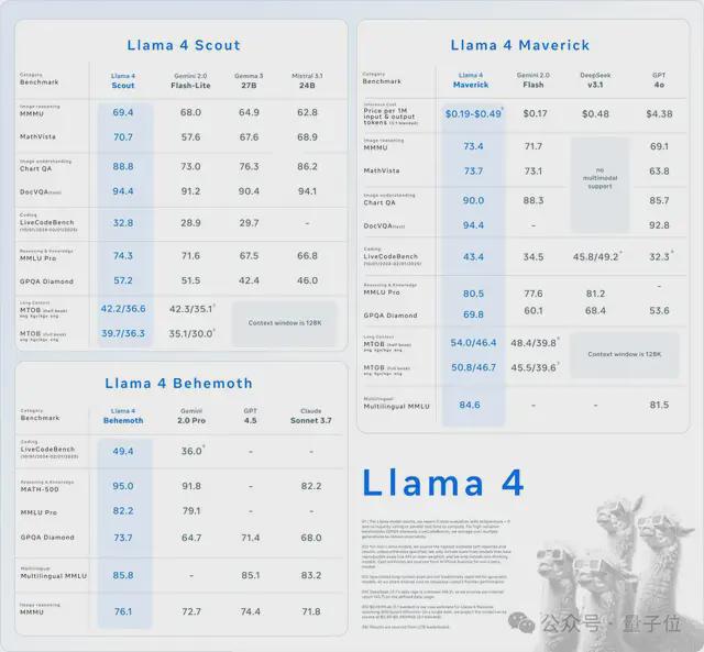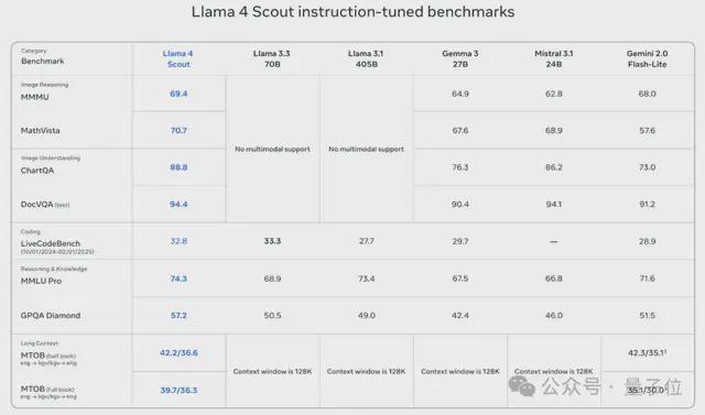 可以看到,在各个测评集上的表现,Llama 4 Scout 样样都是新 SOTA。