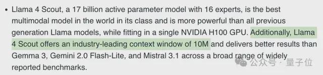 Llama 4 Scout,16 位专家的 170 亿激活参数的多模态模型,单个 H100 GPU 可运行, 同类 SOTA,并拥有 10M 上下文窗口