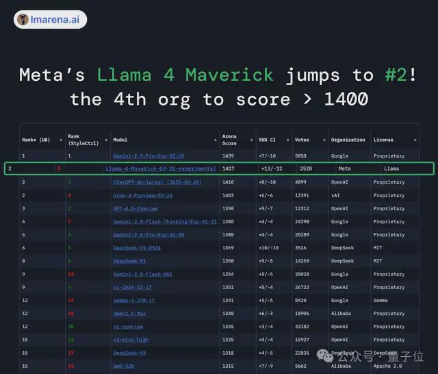 此次发布的 Llama 4 Maverick,在困难提示、编码、数学、创意写作方面并列第一;得分 1417,不仅大大超越了此前 Meta 自家的 Llama-3-405B(提升了 149 分),还成为史上第 4 个突破 1400 分的模型;。