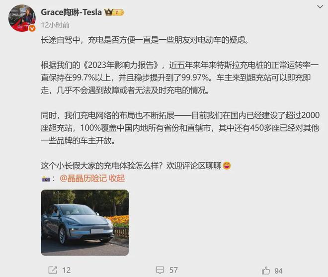 4 月 6 日消息,特斯拉副总裁陶琳发文称,国内充电网络布局不断拓展,已经建设超过 2000 座超充站,100% 覆盖中国内地所有省份和直辖市,其中还有 450 多座已经对其他一些品牌的车主开放。同时她表示,根据特斯拉的《2023 年影响力报告》,近五年来特斯拉充电桩的正常运转率一直保持在 99.7% 以上,并且稳步提升到了 99.97%。车主来到超充站可以即充即走,几乎不会遇到故障或者无法及时充电的情况。(IT 之家)