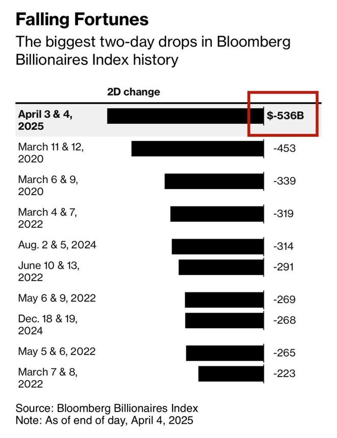据彭博社 4 月 4 日报道,在美国总统特朗普宣布关税新措施引发全球市场暴跌后,全球最富有的 500 人两天内遭遇了「彭博亿万富翁指数」史上最大规模的损失。报道说,从 4 月 3 日股市开盘到 4 日收盘,财富榜上的亿万富翁们总共损失了 5360 亿美元。