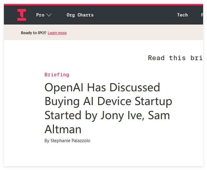 4 月 7 日消息,据《theinformation》报道,OpenAI 正在内部高层之间讨论收购一家名为 io Products 的初创公司。io Products 是由前苹果设计师 Jony Ive 的工作室与 OpenAI 首席执行官 Sam Altman 共同创立的,专注于研发一款基于人工智能的个人设备,该设备有望革新用户与技术的互动方式。