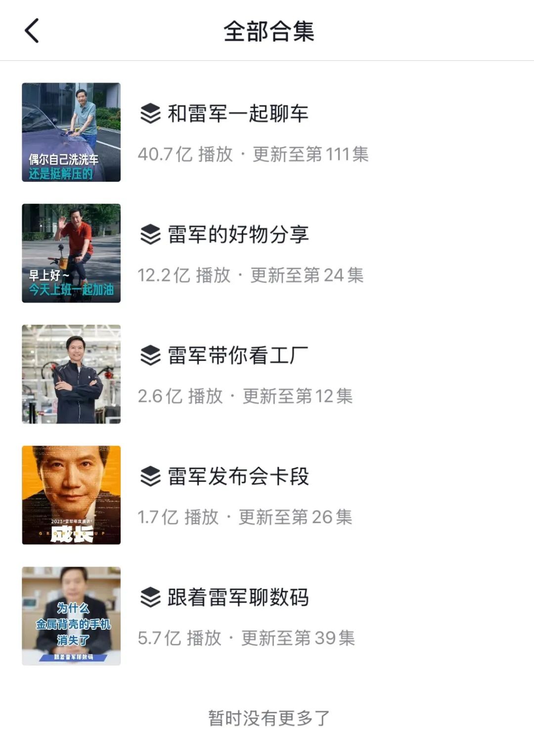 截至 4 月 3 日 12:00,雷军的抖音账号,已有 4557.2 万粉丝,收获了 2.2 亿个赞,已发布的公开作品有 504 个。账号下,做了 5 个合集,分别是和雷军一起聊车(111 集,40.7 亿播放)、雷军的好物分享(24 集,12.2 亿播放)、雷军带你看工厂(26 集,2.6 亿播放)、雷军发布会卡段(39 集,1.7 亿播放)以及跟着雷军聊数码(111 集,5.7 亿播放)。