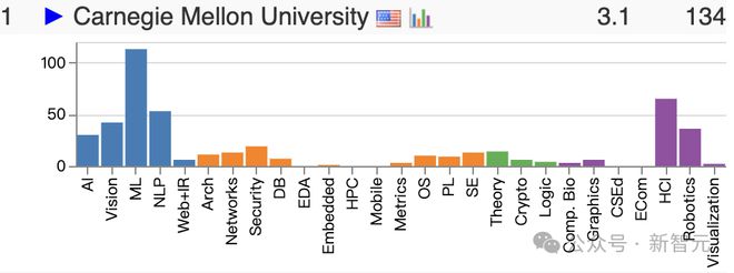 具体来看,CMU 在机器学习、NLP、计算机视觉、AI 领域发表的论文数量最多。