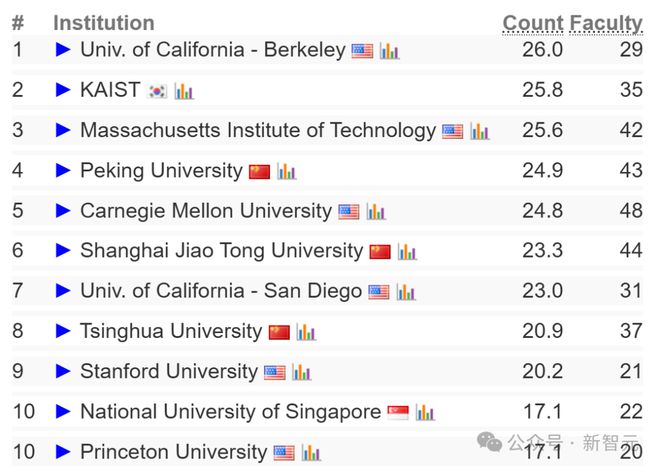 如上文所述,在 AI 这一大领域,全球排名前十的高校/机构是: