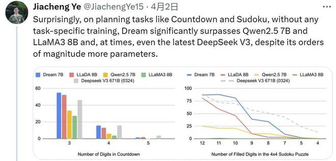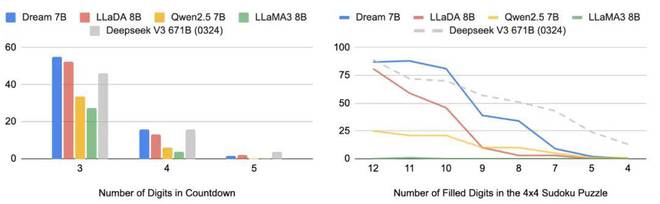 他们选择了《Beyond Autoregression: Discrete Diffusion for Complex Reasoning and Planning》中的 Countdown 和数独任务作为测试平台,这些任务允许研究者精确调控规划难度。评估对象包括 Dream 7B、LLaDA 8B、Qwen2.5 7B 和 LLaMA3 8B,并将最新的 Deepseek V3 671B(0324)作为参考基准。所有模型均在少样本学习环境下进行测试,且未针对这些特定任务进行过专门训练。