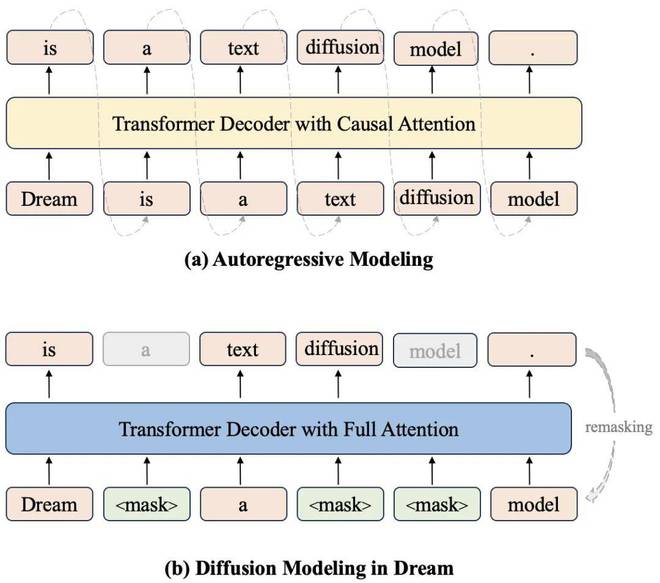 自回归建模和 Dream 扩散建模的比较。Dream 以移位方式预测所有掩码 token,实现与 AR 模型的最大架构对齐和权重初始化。