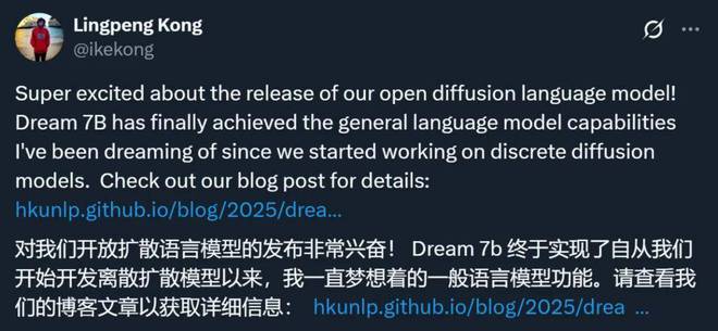 这项工作的作者之一、香港大学助理教授孔令鹏表示,「Dream 7B 终于实现了我们从开始研究离散扩散模型以来一直梦想的通用语言模型能力」。