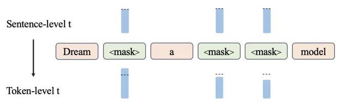 上下文自适应 token 级噪声重排机制示意图。Dream 通过精确测量上下文信息量,为每个掩码 token 动态调整 token 级时间步 t。