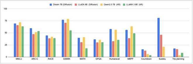 结果清晰显示,Dream 在同等规模模型中表现卓越。特别值得一提的是,两种扩散模型均显著超越了同级别 AR 模型,在某些情况下甚至优于最新的 DeepSeek V3,尽管后者拥有数量级更庞大的参数规模。这一现象背后的核心洞见是:扩散语言模型在处理多重约束问题或实现特定目标任务时更有效。
