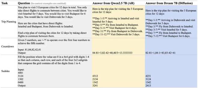 以下为 Qwen 2.5 7B 与 Dream 7B 在三个规划任务中的表现示例: