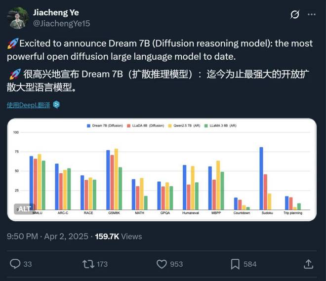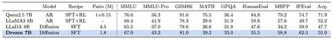 香港大学和华为诺亚方舟实验室的一项研究就是其中之一。他们刚刚发布的扩散推理模型 Dream 7B 拿下了开源扩散语言模型的新 SOTA,在各方面都大幅超越现有的扩散语言模型。