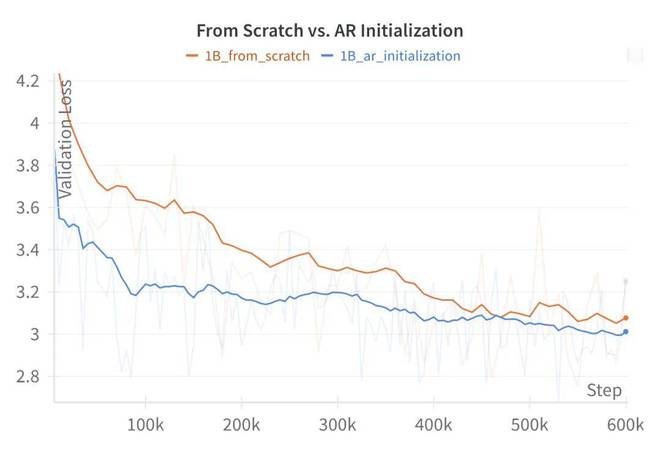 Dream 1B 模型上 200B token 的从零训练与使用 LLaMA3.2 1B 进行 AR 初始化的损失对比。AR 初始化虽然在从因果注意力向全注意力转变初期也会经历损失上升,但在整个训练周期中始终保持低于从零训练的水平。
