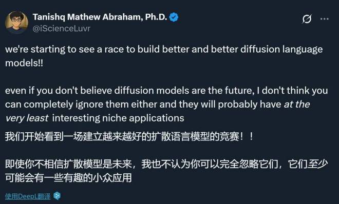目前,自回归(AR)模型在文本生成领域占据主导地位,几乎所有领先的 LLM(如 GPT-4、DeepSeek、Claude)都依赖于这种从左到右生成的架构。虽然这些模型表现出了卓越的能力,但一个基本问题浮现出来:什么样的架构范式可能定义下一代 LLM?