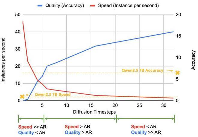 在上述演示中,作者展示了每步生成单个 token 的情况。然而,每步生成的 token 数量(由扩散步骤控制)可以根据需求动态调整,从而在速度和质量之间提供可调的权衡:减少步骤可获得更快但粗略的结果,增加步骤则以更高计算成本换取更优质的输出。这一机制为推理时间 scaling 开辟了全新维度,不是替代而是补充了主流大型语言模型(如 o1 和 r1)中采用的长思维链推理等技术。这种灵活可调的计算 - 质量平衡机制,正是扩散模型相较传统 AR 框架的独特优势所在。