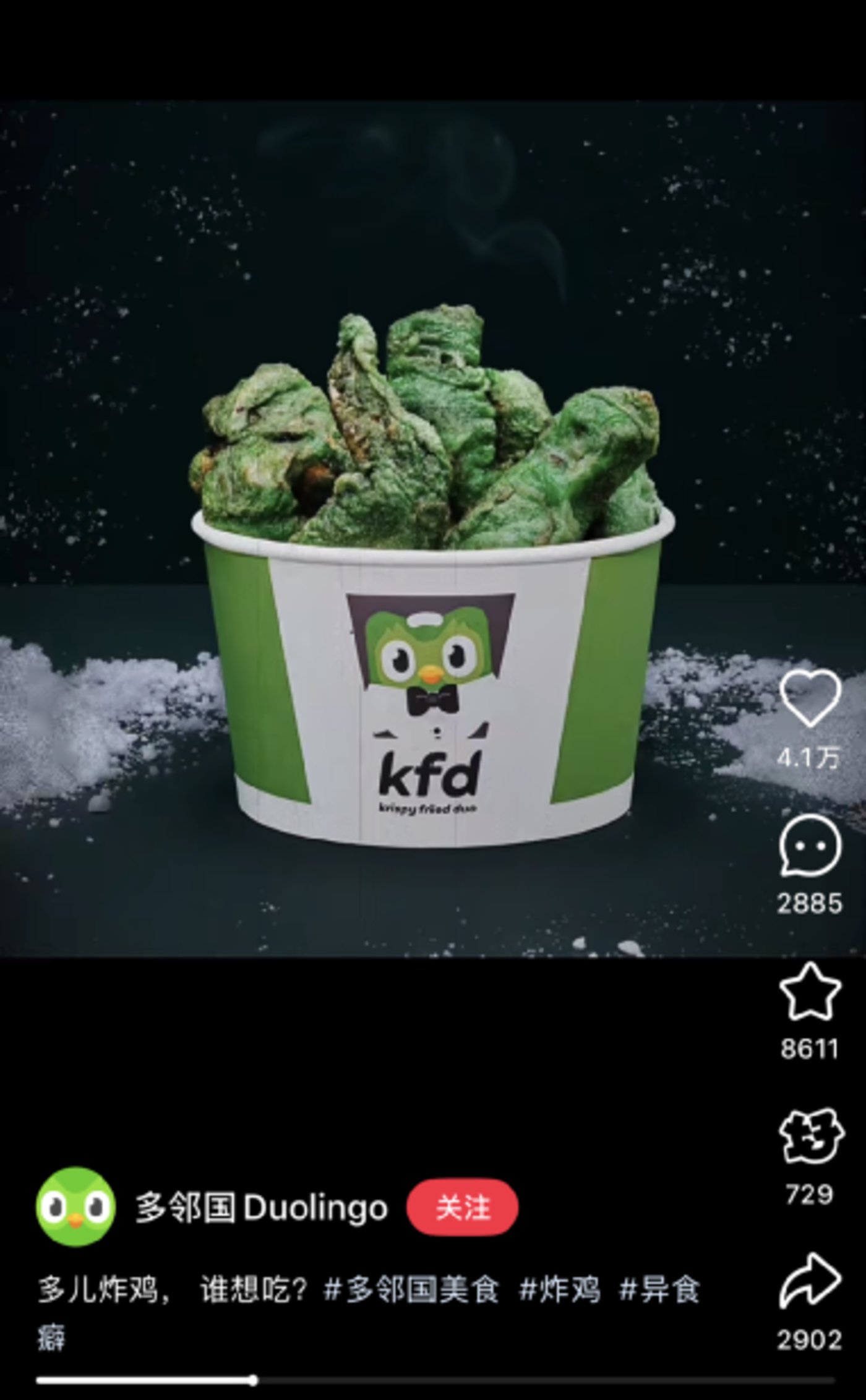 另一个例子是非常出圈的绿色炸鸡。这是多邻国在日本与肯德基联名推出的套餐 KFD(“油炸多儿”),因为品牌洞察到,日本家庭在圣诞节有预订“肯德基家庭套餐”的习惯。而且这个联名套餐也与语言打卡相连,如果用户没有打卡,就会收到一个特辣版本,并接受惩罚。