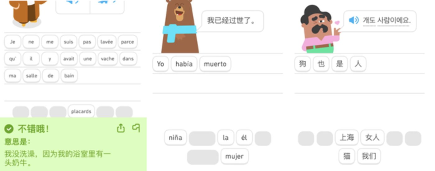 它将语言学习设置成闯关式的“技能树”(后更新为“路径”),用户每完成一节课程就可以获得经验值(XP),积累连胜奖励(Streaks),并在排行榜中与他人竞争。用过的朋友应该都体会过被疯狂奖励的快感,包括每答对一题的魔性音效和花式赞美,以及最后的经验值暴涨和升级。