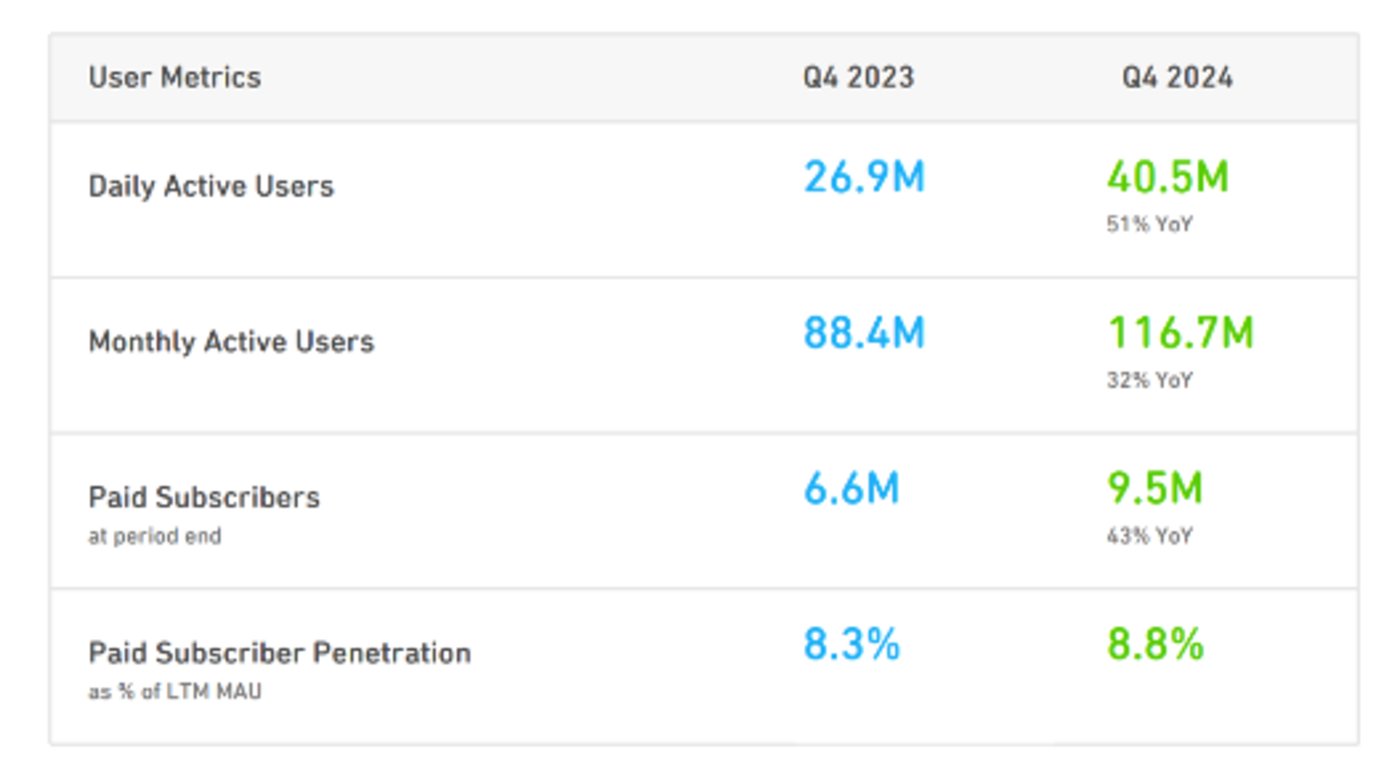 这个累计下载量超 5 亿的语言学习 App,2024 年的日活用户达到 4050 万,同比增长 51%,月活超 1.167 亿,同比增长 32%,并新增了有史以来最多的净付费订阅用户。