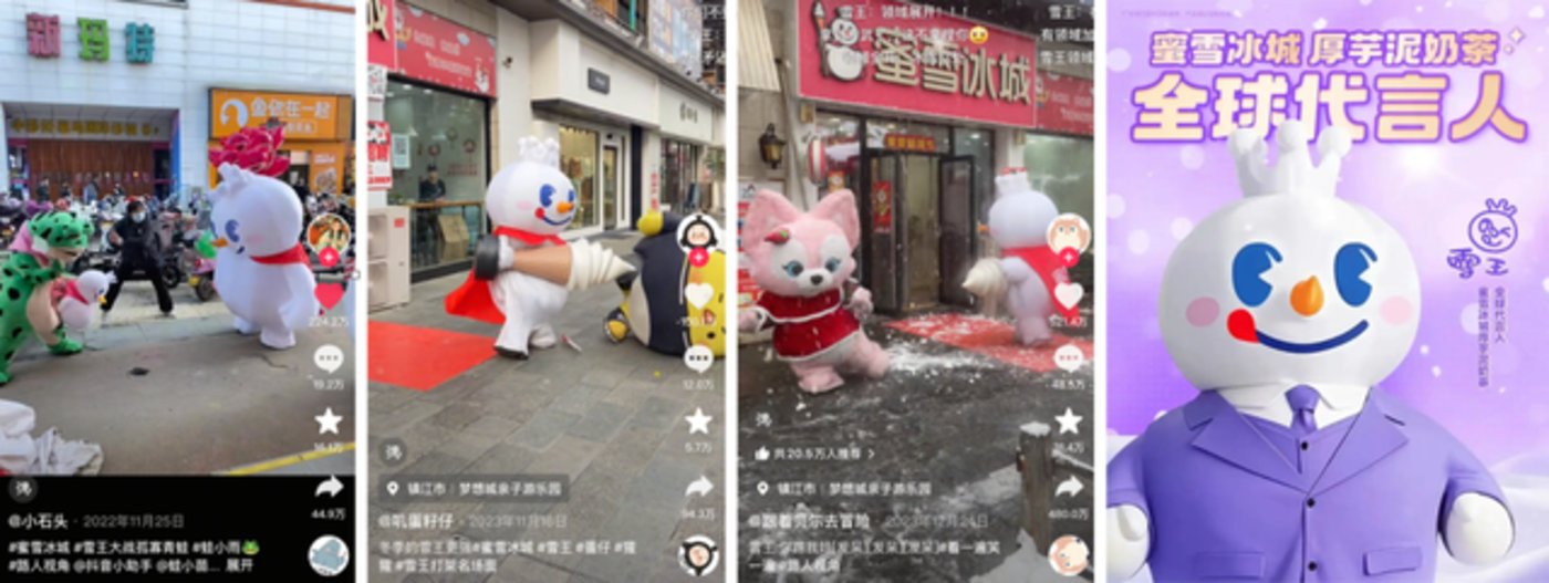 多邻国的多儿,总让我想到蜜雪冰城的雪王。雪王的走红,可能是从在街上跟其他充气玩偶打架开始的,从此“街溜子”的形象深入人心。后来品牌官宣雪王成为新品“厚芋泥奶茶”全球代言人,还在香港上市时去敲钟,都引发了网友热议。