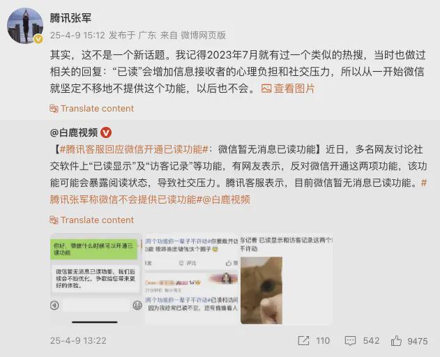 4 月 9 日下午,腾讯公司公关总监张军在微博发文称,“‘已读’会增加信息接收者的心理负担和社交压力,所以从一开始微信就坚定不移地不提供这个功能,以后也不会。”