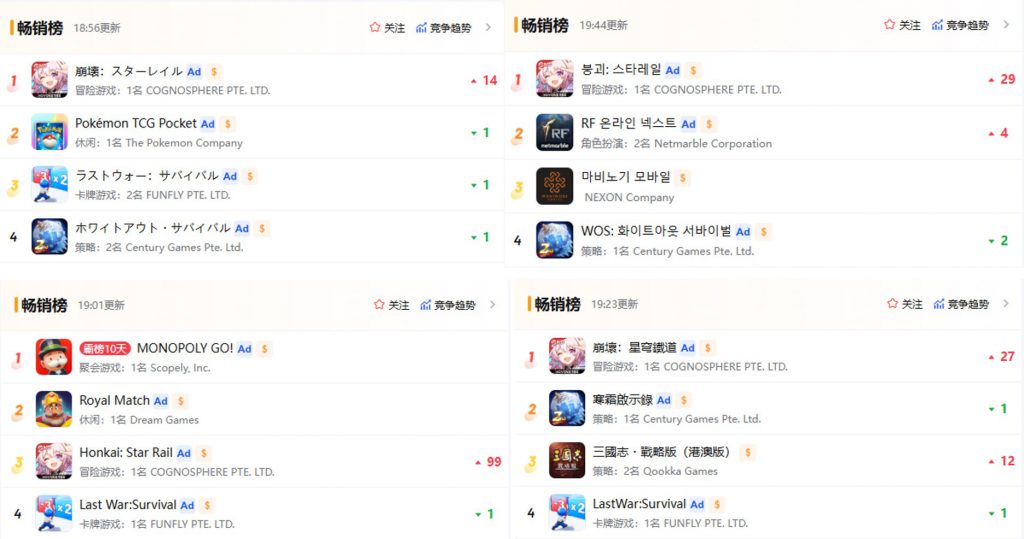 而今天《崩铁》版本更新过后所创下的成绩很可能也是史无前例的,截至完稿时,《崩铁》在国区 iOS 畅销榜顺利登顶,日本、韩国、繁体区也全部登顶,美国则是近一年来首次闯入畅销榜前3。