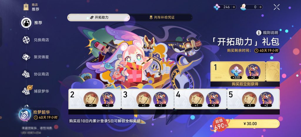 另一个比较显著的变化则是本次《崩铁》二周年版本还首次推出了直接用人民币购买的抽卡资源礼包(之前游戏内的礼包是使用付费货币古老梦华购买,并且礼包内容主要是养成资源,不涉及抽卡资源)。