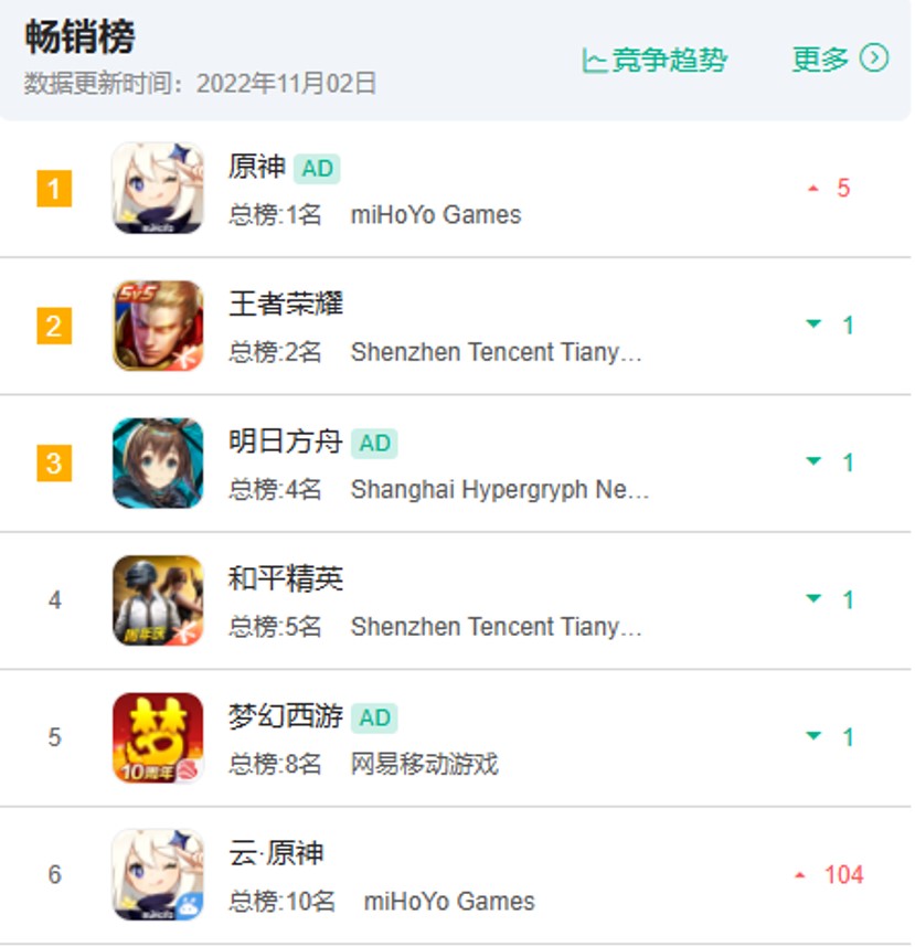 事实上,游戏本体与云游戏同时闯入畅销榜前十还是相当困难的,能达成这一成就的游戏少之又少。在 GameLook 印象里上一个达成此成就的游戏正是米哈游自己的《原神》。2022 年 11 月 2 日《原神》的游戏本体和云游戏分别位列国区 iOS 畅销榜第 1 名、第 6 名。巧合的是,《原神》在这天进行的版本更新刚好也是 3.2 版本。