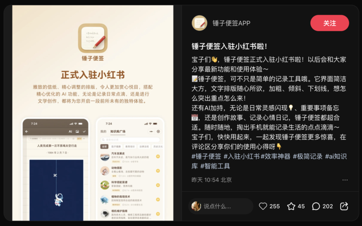 昨日,锤子便签 App 宣布正式入驻小红书,并表示未来将会在平台上与用户分享最新功能与体验。