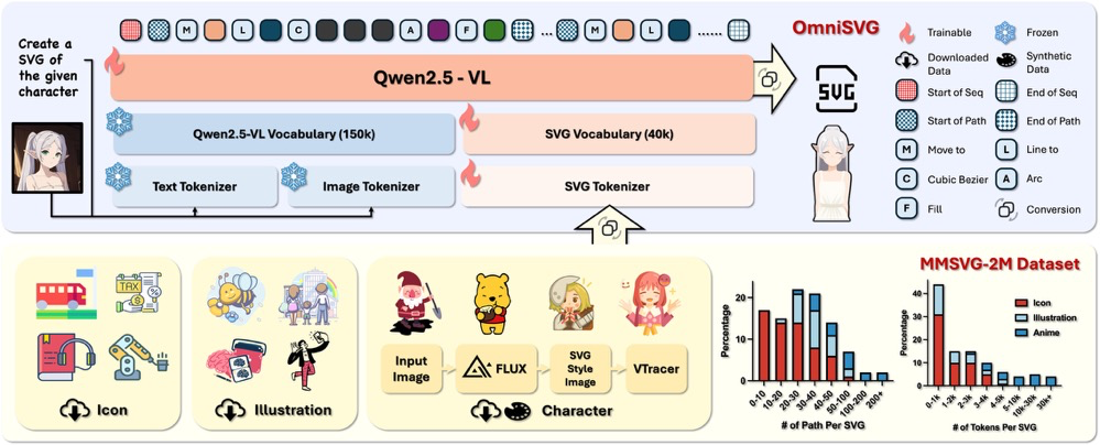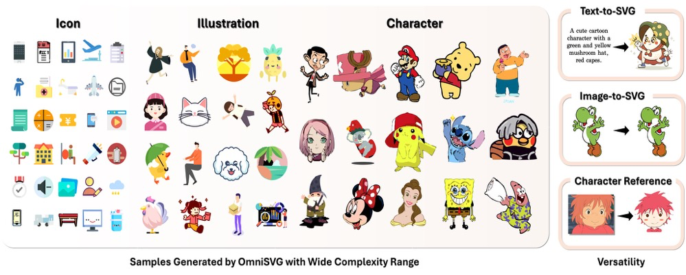 复旦大学和阶跃星辰将要出一款端到端多模态 SVG 生成模型:OmniSVG,核心是支持从简单图标到复杂动漫角色的生成。