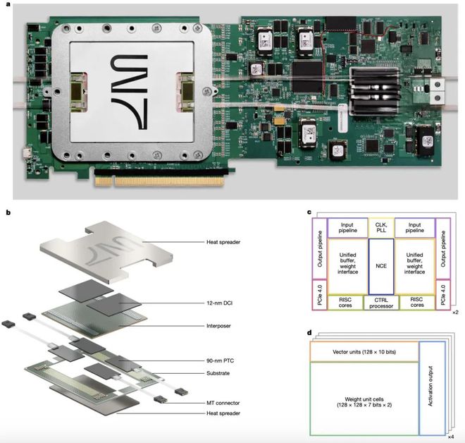 具体而言,该光子 AI 处理器集成了四个 128×128 的光子张量核心(PTC,负责光信号的计算),每个 PTC 包含 128 个 10 位光子向量单元和 128×128 个 7 位权重单元。PTC 通过高速光电信号与数字控制芯片(DCI,管理光子芯片的运行,并将光信号转换为数字信号)相连,实现了高效的数据传输和处理。