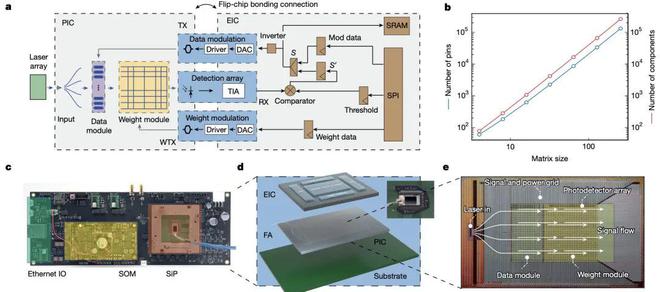 他们将光子芯片和电子芯片通过 2.5D 封装技术紧密集成在一个封装内,实现高密度信号连接,从而能够支持大规模矩阵运算。系统通过光调制器和探测器实现高速光电信号转换,并通过嵌入式静态随机存取存储器(SRAM)管理数据存储。