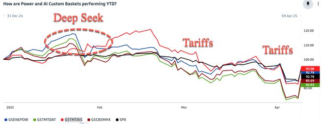 数据显示,从年初至今,自 1 月 DeepSeek 事件发生以来,高盛的“能源 +AI”主题投资组合一直处于下跌趋势。