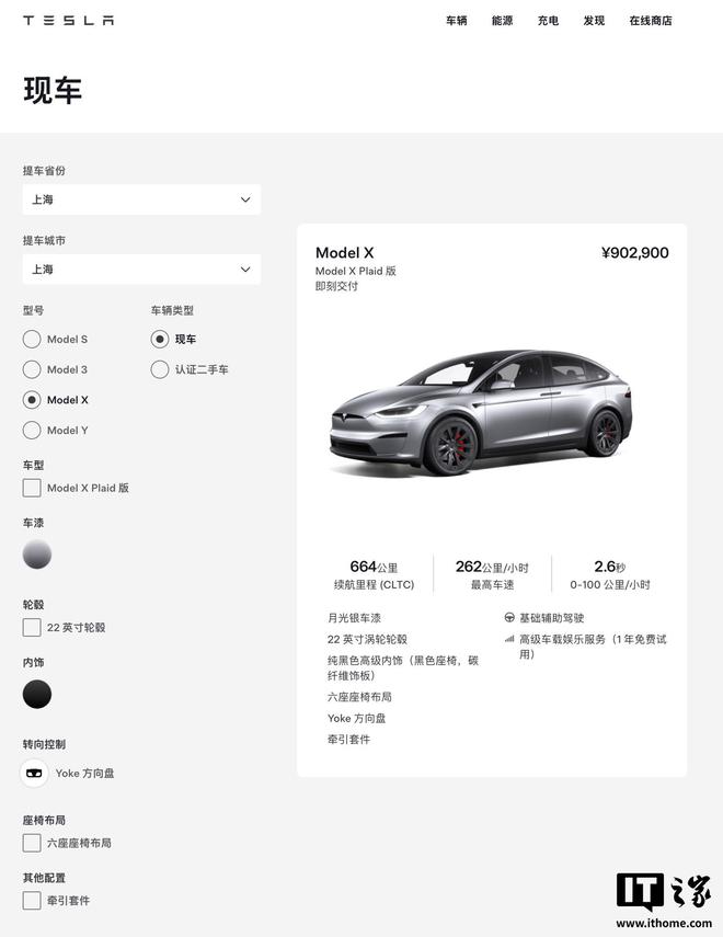 以上海地区提车为例,目前特斯拉中国提供一款“即刻交付”的 Model S Plaid 版,定价为 92.39 万元人民币;而 Model X 方面同样提供一款“即刻交付”的 Plaid 版,定价为 90.29 万元人民币。