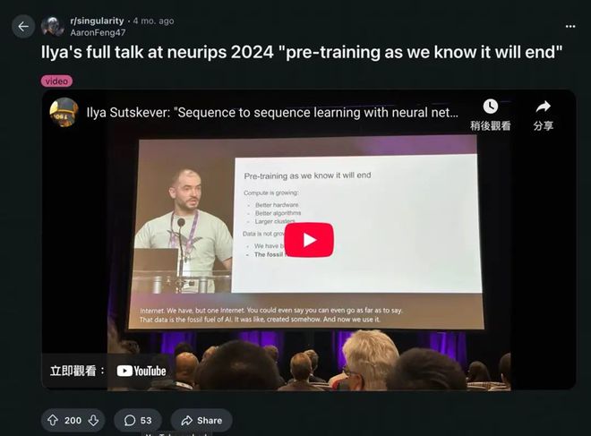 在 NeurIPS 2024 会议上,OpenAI 联合创始人 Ilya Sutskever 明确指出:「Pre-training as we know it will end」, 这一判断是对传统预范式极限的清晰警示。