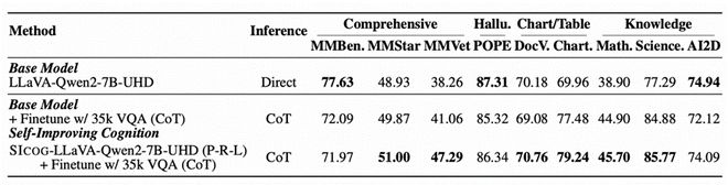 为了验证 SICOG 框架的有效性,研究在 12 个主流多模态评测集上进行了系统性评估,涵盖图表理解、数学推理、抗幻觉能力等多个关键维度。实验结果表明,SICOG 能显著提升模型的综合表现,具体成果如下: