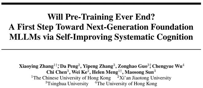 传统多模态大模型(MLLMs)依赖海量标注数据与静态预训练范式,面临数据稀缺与能力增长受限的双重瓶颈。为突破这一困境,本文提出全新框架SICOG(Self-Improving Systematic Cognition),首次构建了涵盖「后训练增强—推理优化—再预训练强化」的三位一体自进化机制,重新定义了预训练边界,为下一代 MLLMs 注入动态认知与持续学习能力。