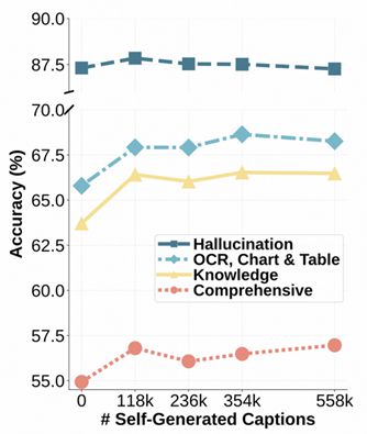 随着自生成数据量从 11. 8 万条提升至 21.3 万条,模型性能持续上升,呈现出良好的扩展性与学习能力;