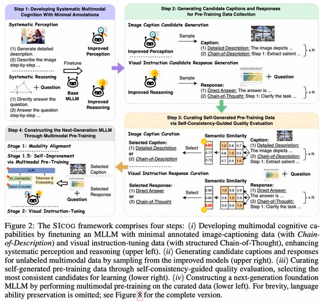SICOG 的关键创新在于实现了模型的「学中实践、实践中进化」:从少量种子数据出发,模型通过「看图总结+解题推理」主动构建多任务样本,实现数据生成与学习闭环。无需大规模人工标注,即可高效扩展预训练数据,根本性缓解当前高质量多模态数据稀缺的问题。